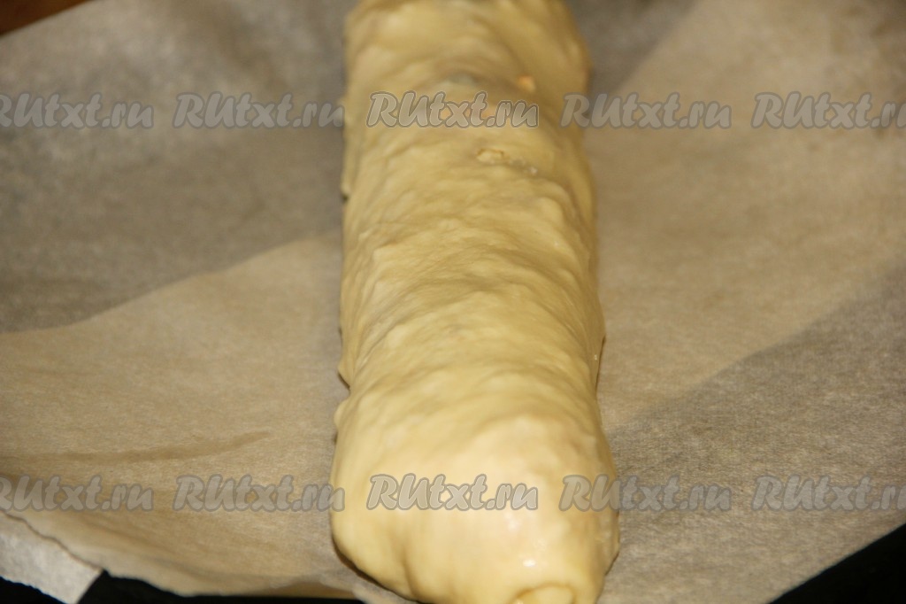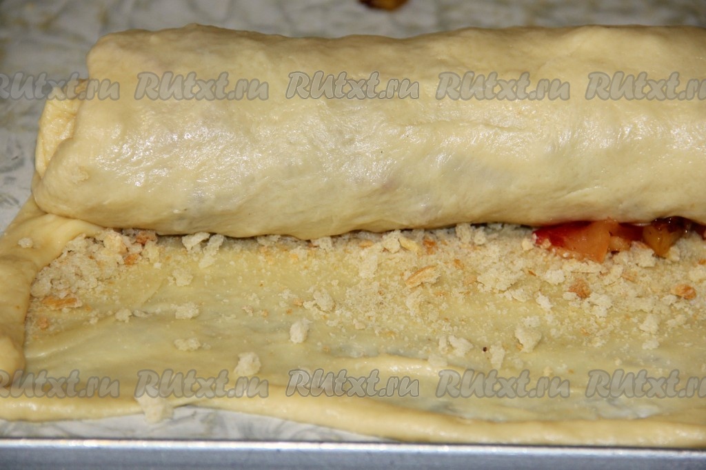 Края теста с немного подворачиваем во внутрь. Затем аккуратно скручиваем штрудель с помощью полотенца в рулет, начиная с широкой стороны.