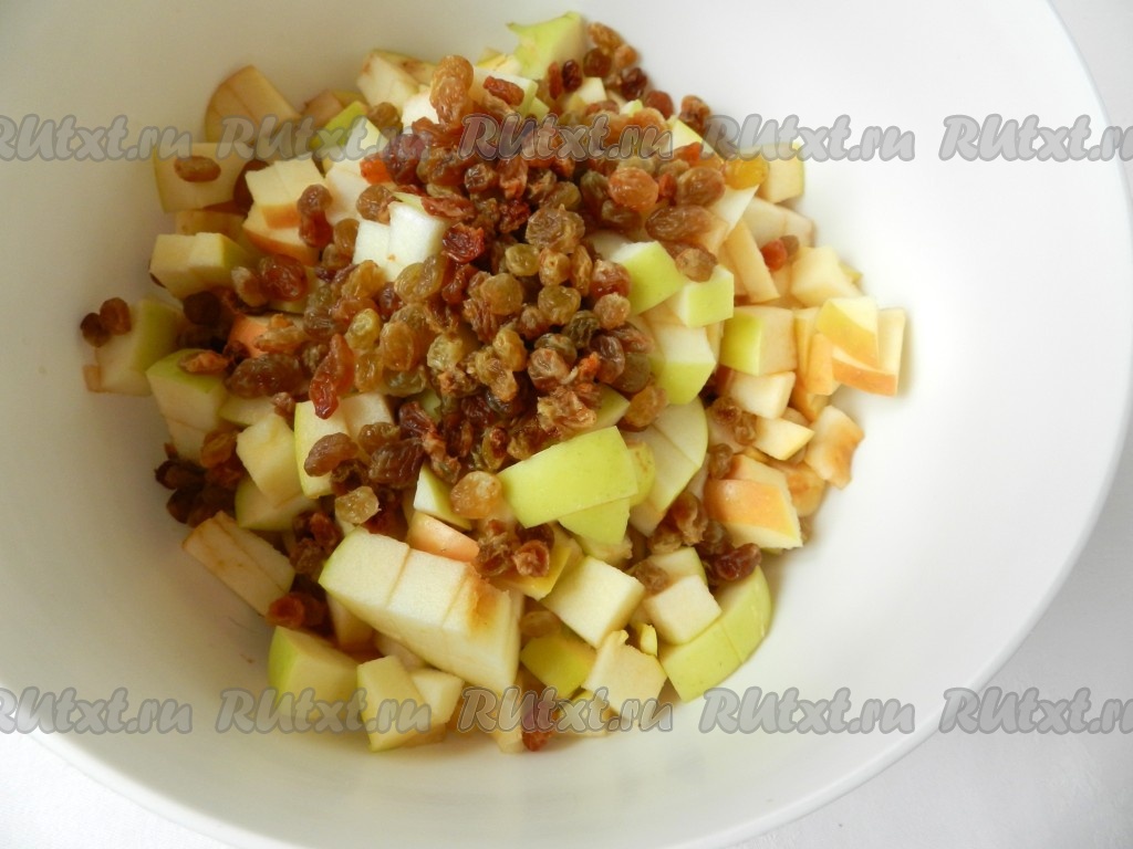 Изюм промыть в горячей воде. Соединить яблоки, лук, изюм.