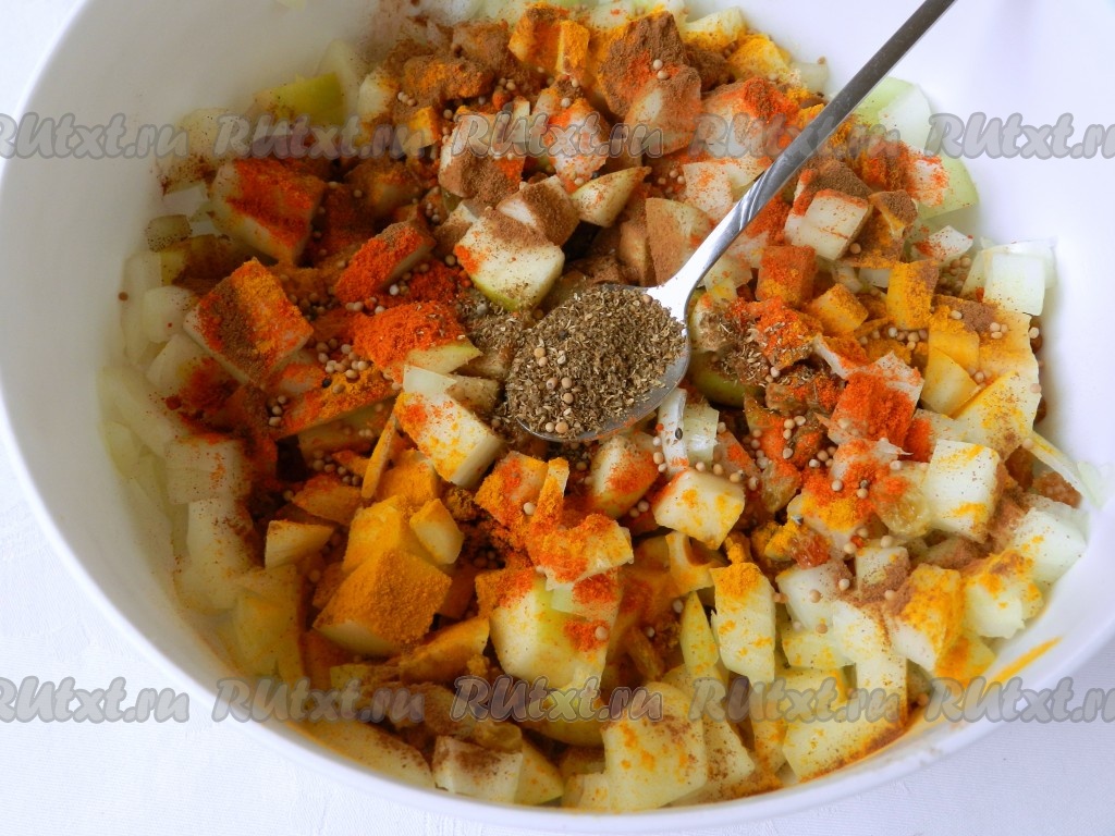 Добавить по одной чайной ложке специй, соль и сахар, перемешать.