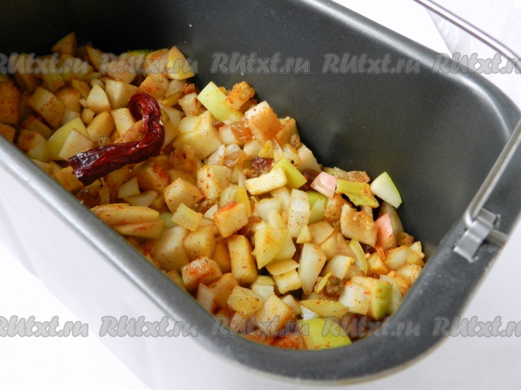 Переложить чатни из яблок в контейнер хлебопечки, влить яблочный уксус и воду, добавить острый перец. Установить контейнер в хлебопечку, выбрать режим "варенье" и включить хлебопечку*.