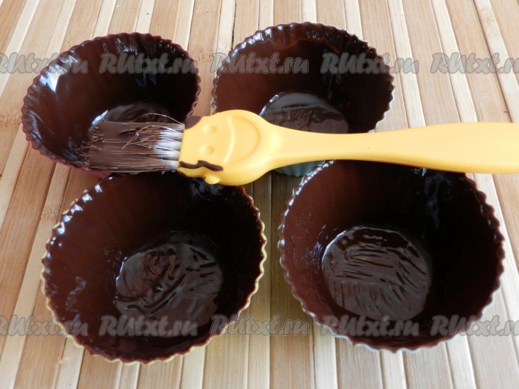 Слой шоколада должен быть равномерным, чтобы не было просветов. Когда все формочки смазаны шоколадом, поставить их в холодильник на 15-20 минут, чтобы шоколад застыл.