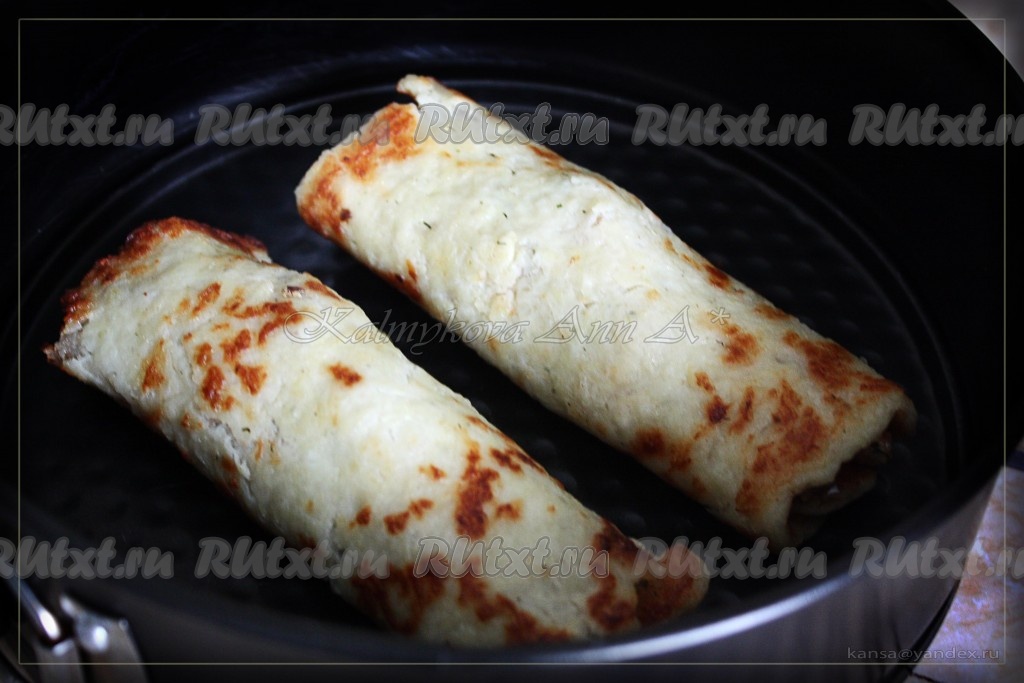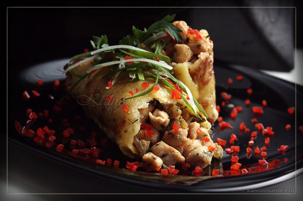 Берем картофельный драник, укладываем начинку и сворачиваем рулетом.