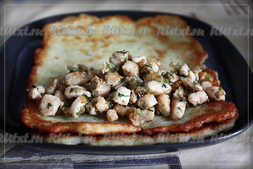 Подаем драники с куриной начинкой с любимым соусом или просто так.