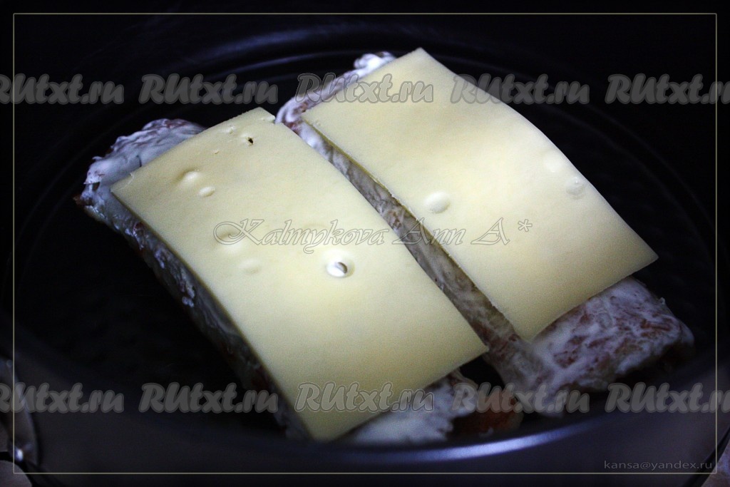 Сверху обмазываем сметанкой и кладем сыр.