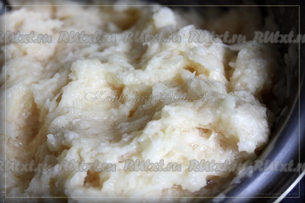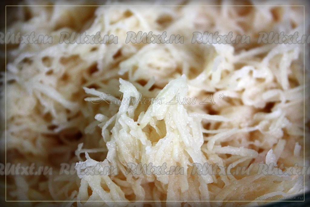 Картошку чистим, трем на мелкой терке, сок отжимаем, но не весь (я половину стакана отжала).