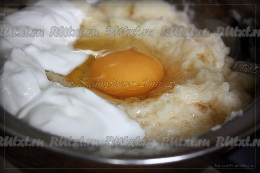 Добавляем сметану, яйцо, перемешиваем.