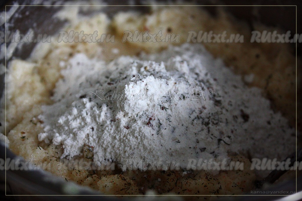 Далее добавляем муку, соль, специи, ещё раз перемешиваем.