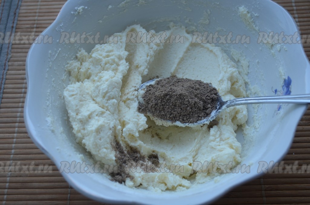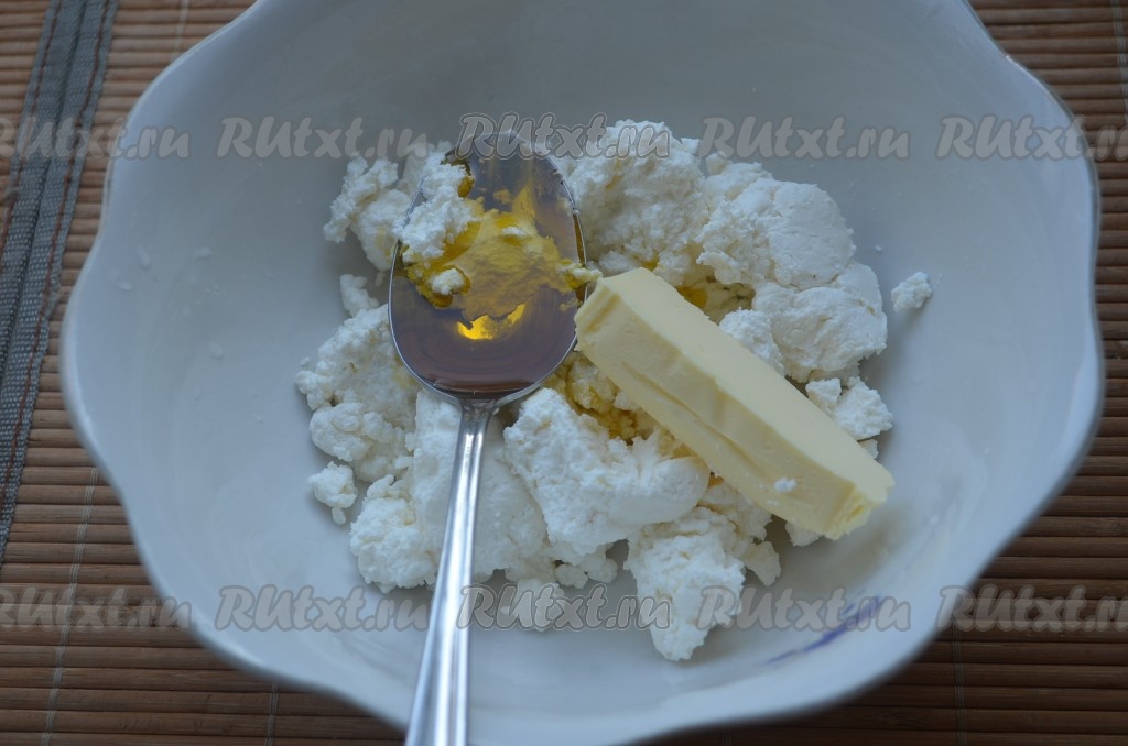 Творог тщательно растереть со сливочным и растительным маслом.