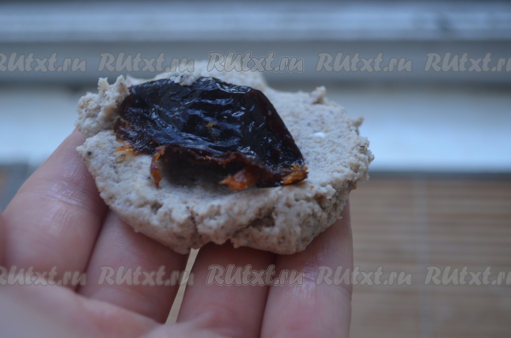 Разделить тесто на шарики, размером с грецкий орех. Каждый шарик размять на ладони в лепешку, внутрь положить чернослив, защипнуть.