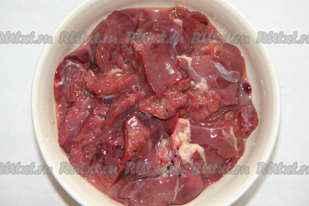 Куриную печень моем. Крупную печень можно разрезать на 2-3 части. Выкладываем печень в глубокую миску.