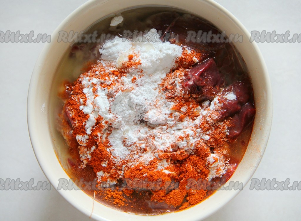 К печени добавляем крахмал, специи (я всыпала 0,5 столовой ложки паприки), соль, перемешиваем.