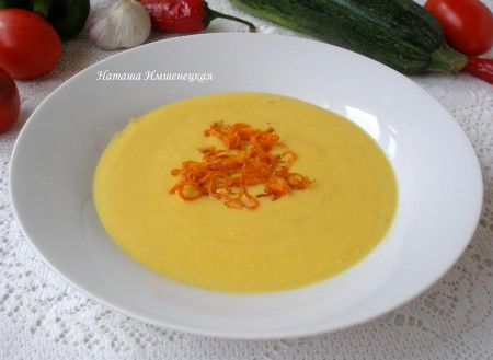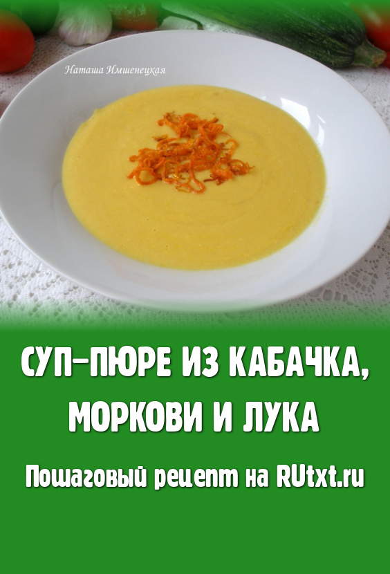 Подавать суп-пюре из кабачка, моркови и лука в горячем виде. Можно посыпать свежей зеленью. Я использовала для украшения тонко нарезанную и обжаренную морковь.