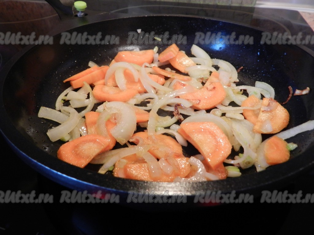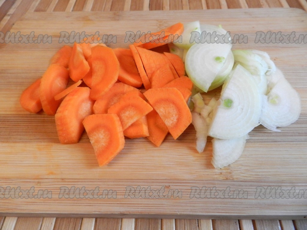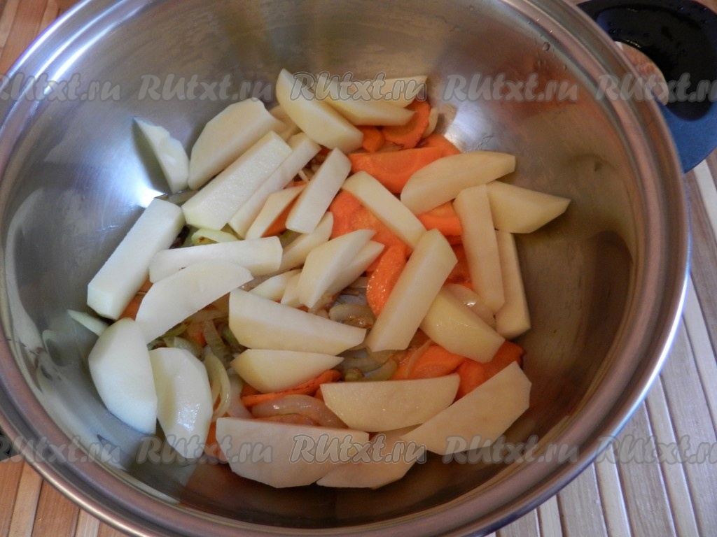 Переложить в кастрюлю лук и морковь, добавить очищенный и нарезанный картофель, залить водой так, чтобы она покрывала овощи на 1-2 см, и поставить варить.