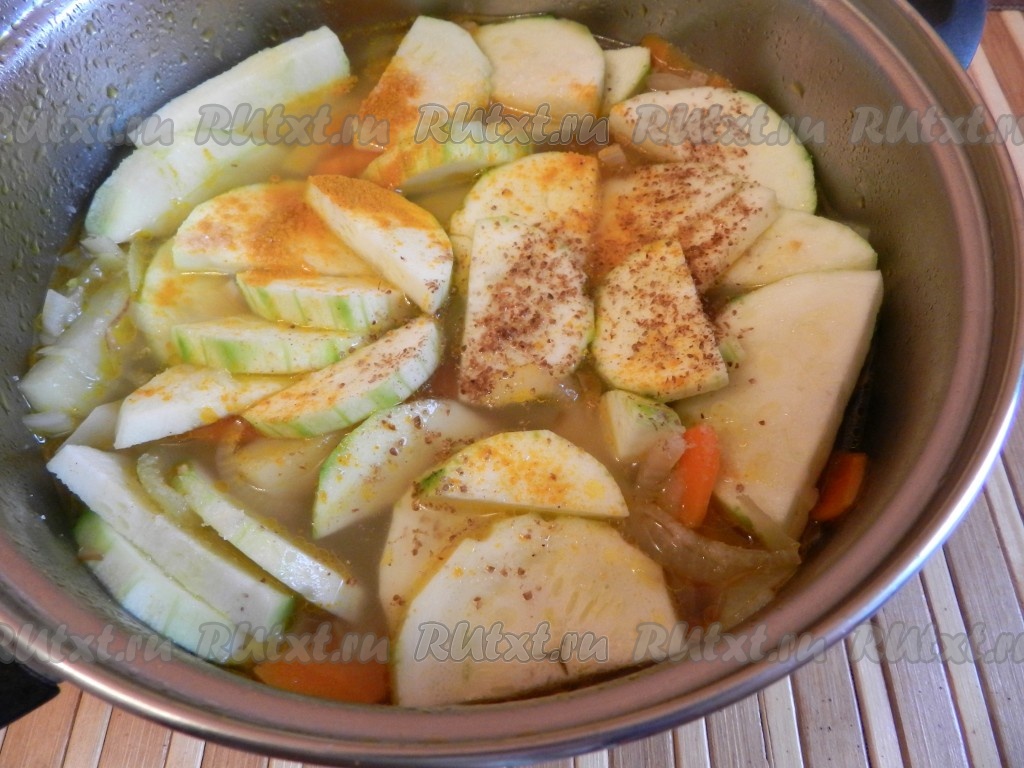 Через 10 минут добавить в суп кабачок. Посолить, добавить специи, если нужно долить воды и варить овощной суп еще 10 минут.
