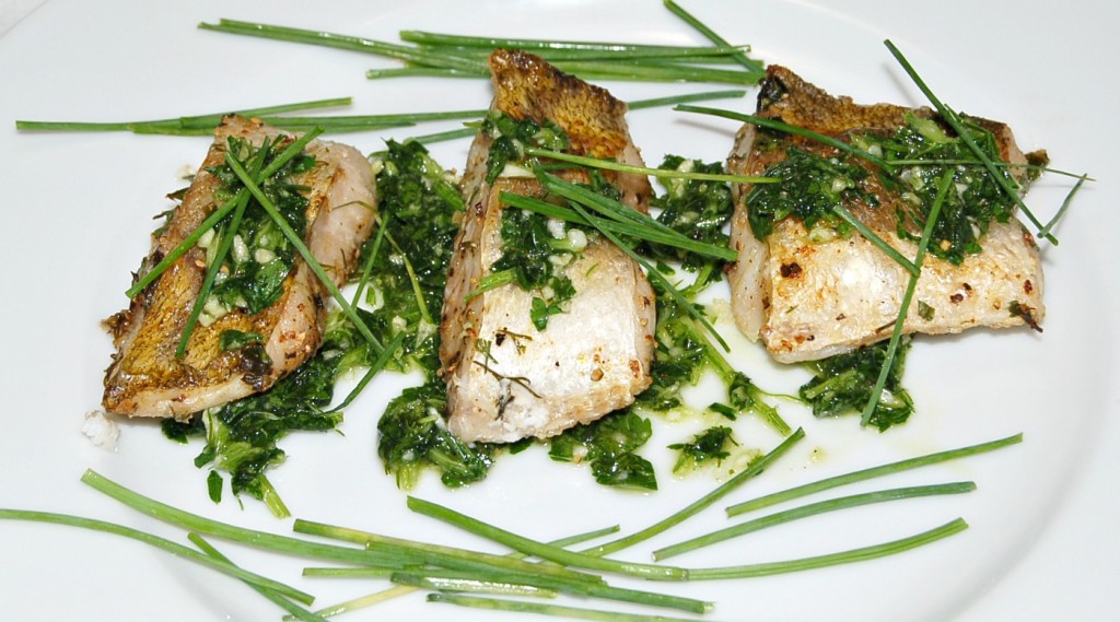Выложить рыбку на тарелку с приготовленным соусом из трав. Запеченную рыбу с зеленью можно украсить шнитт-луком.