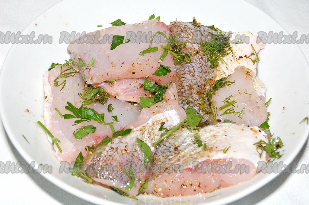 Добавить к нарезанной рыбе петрушку, укроп, лимонный перец и соль.