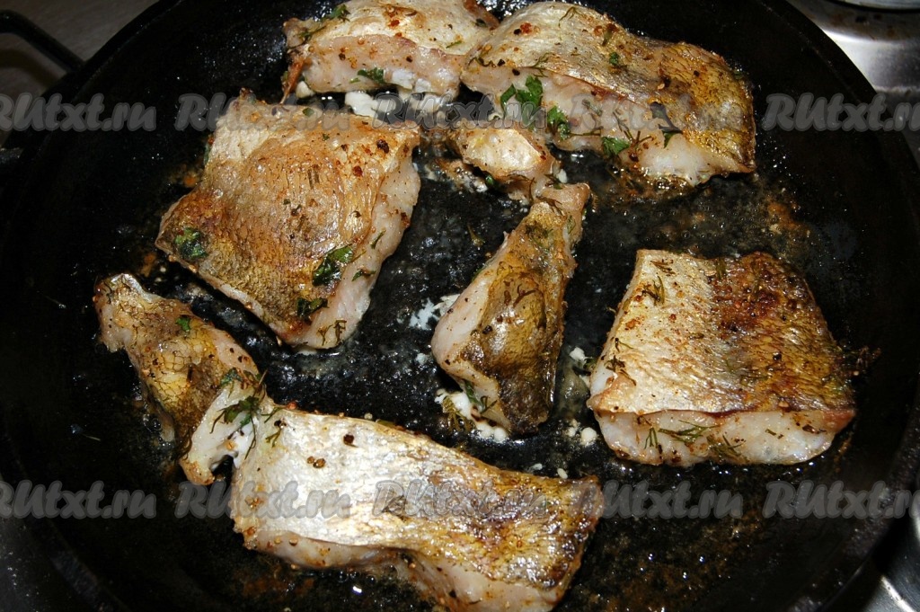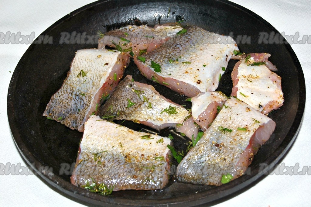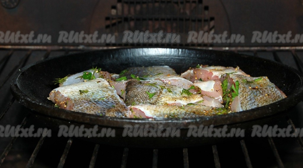 Отправить сковородку с рыбой в заранее нагретую до 200 градусов духовку на 25 минут.