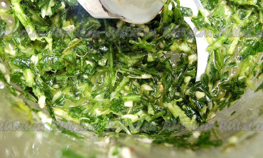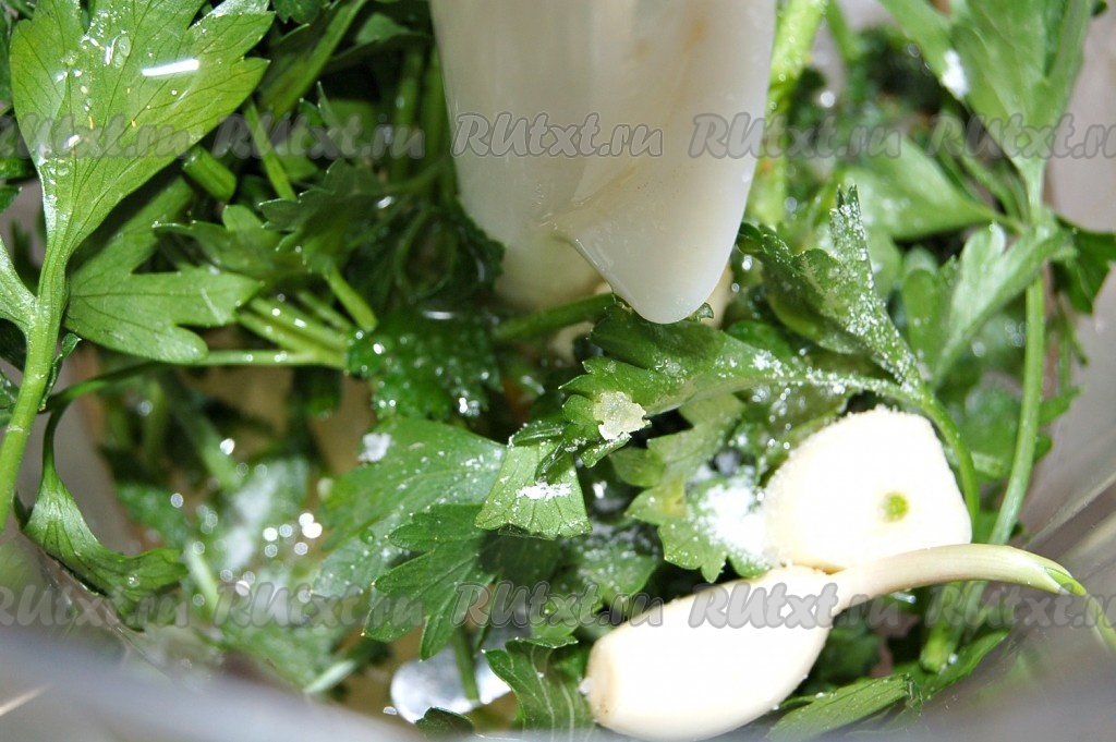 Пока рыба запекается в духовке, приготовить соус. Для этого поместить в блендер петрушку, чеснок, перец, соль и оливковое масло. Все взбить.