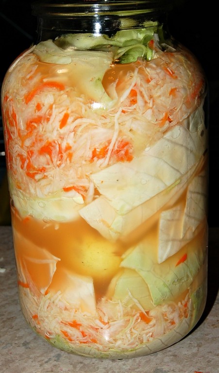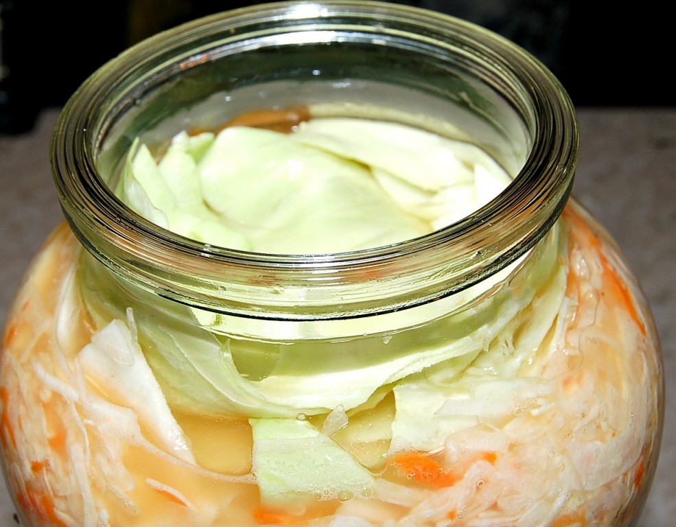 Сверху установить груз и оставить банку с капустой на 3 дня при комнатной температуре. Каждый день нужно протыкать деревянной палочкой до дна банки, чтобы выходили газы, образующиеся при брожении. Если этого не делать, капуста получится с горчинкой. Затем вынести квашеную капусту с яблоками на холод.