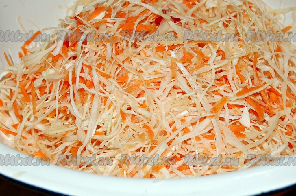 Натереть на крупной терке морковь и вместе с солью добавить к капусте.