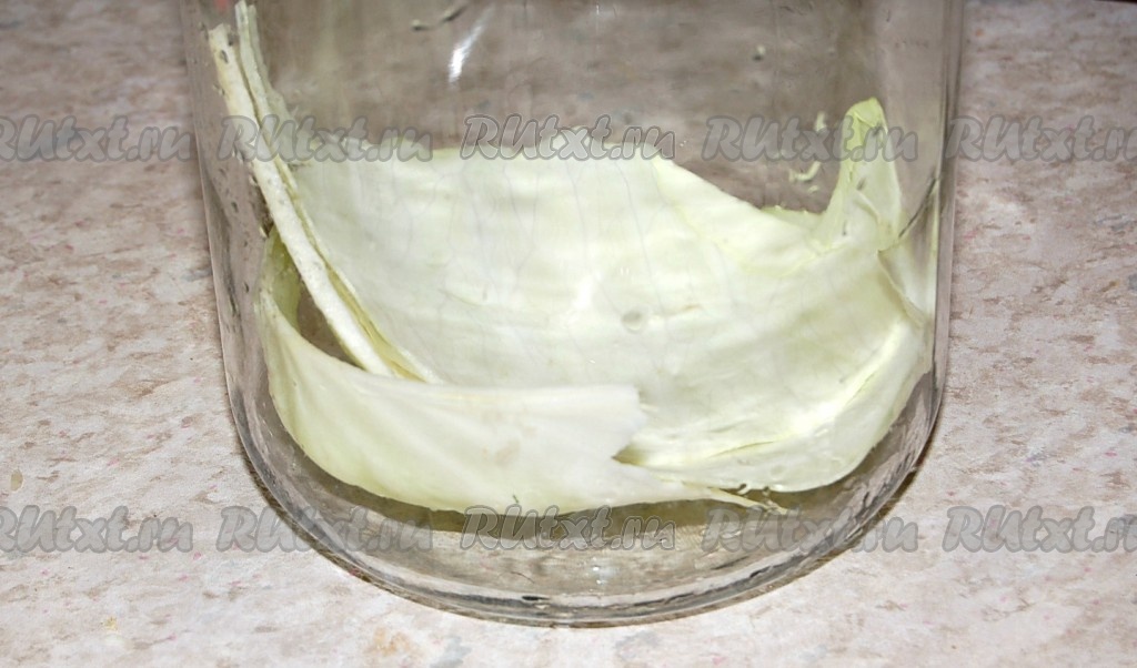На дно емкости, в которой будет кваситься капуста (у меня 5-литровая стеклянная банка), выложить капустные листья.