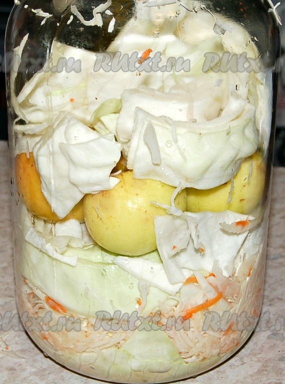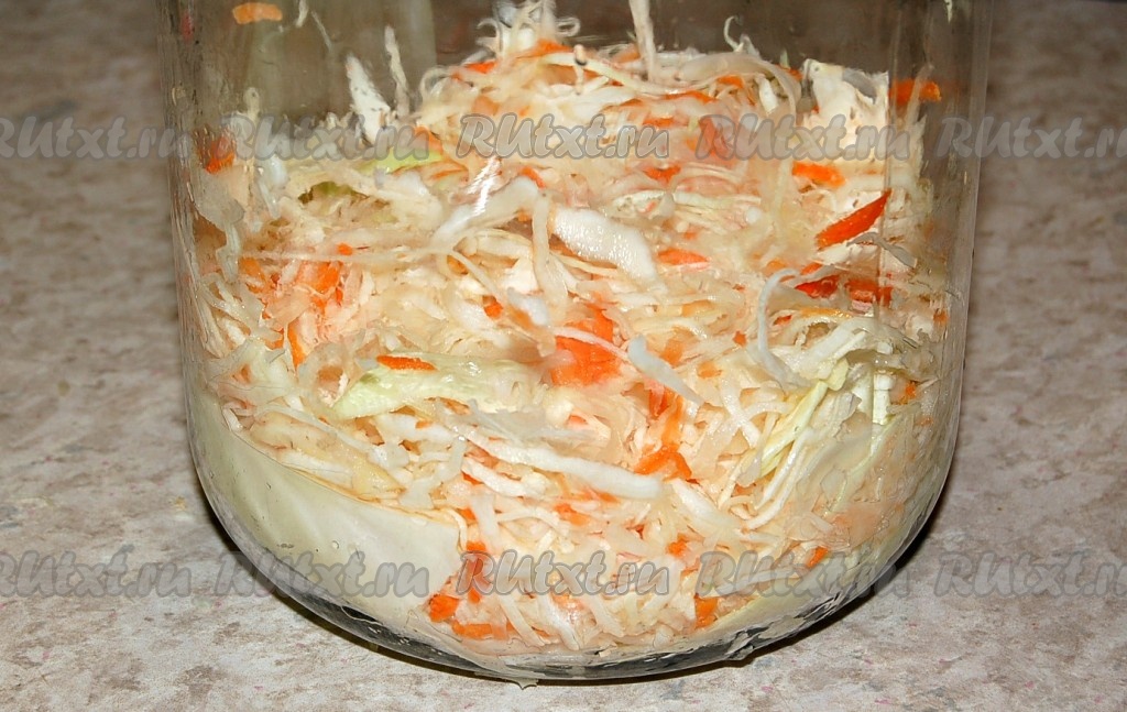 И до самого верха банки разместить шинкованную капусту. Стараясь как следует ее утрамбовать, чтобы капуста дала сок.