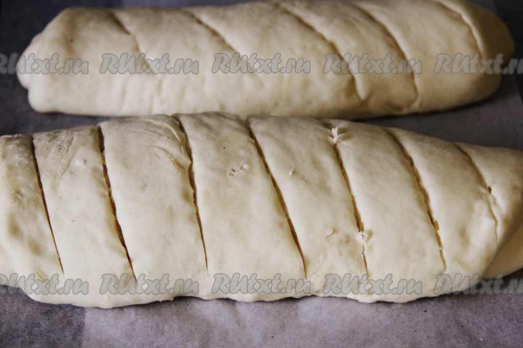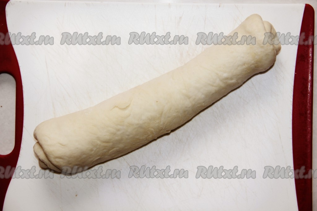 Разделить тесто на два равных кусочка. В будущем это будет 2 хлеба. Если хотите, то можно разделить на три части или сделать один большой круглый хлеб. Каждую часть раскатать скалкой или растянуть руками по доске. В итоге должен получиться прямоугольник из теста.