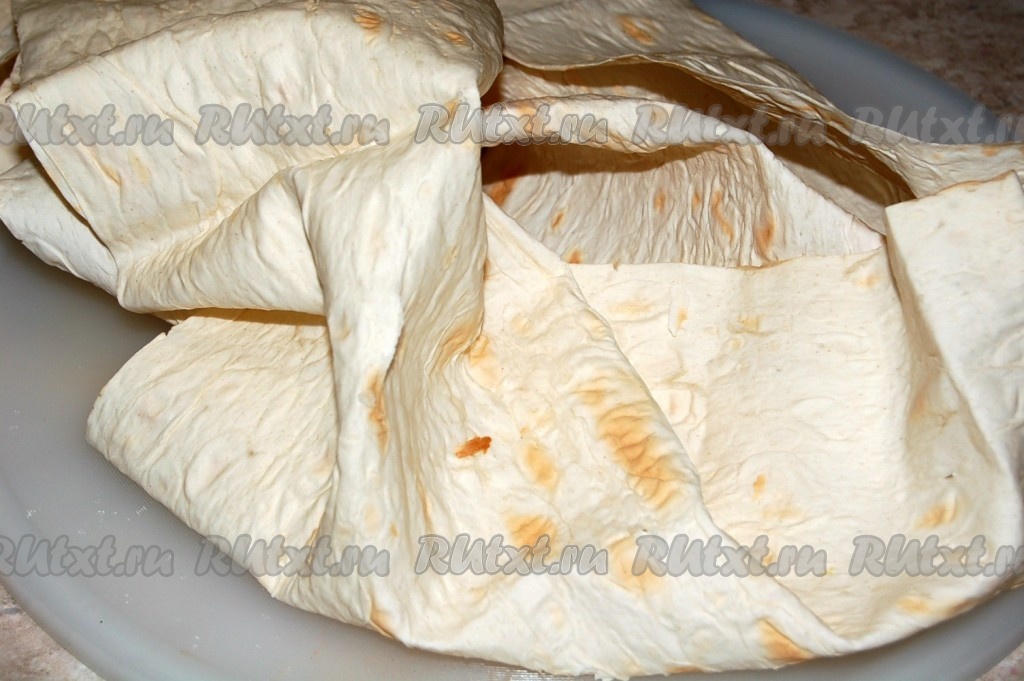 Подготовить лаваш. У меня был длинный лаваш в виде рулета (больше 1 метра в длину), я его разрезала ножницами на нужные мне листы.