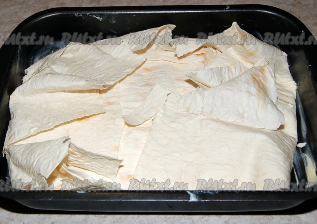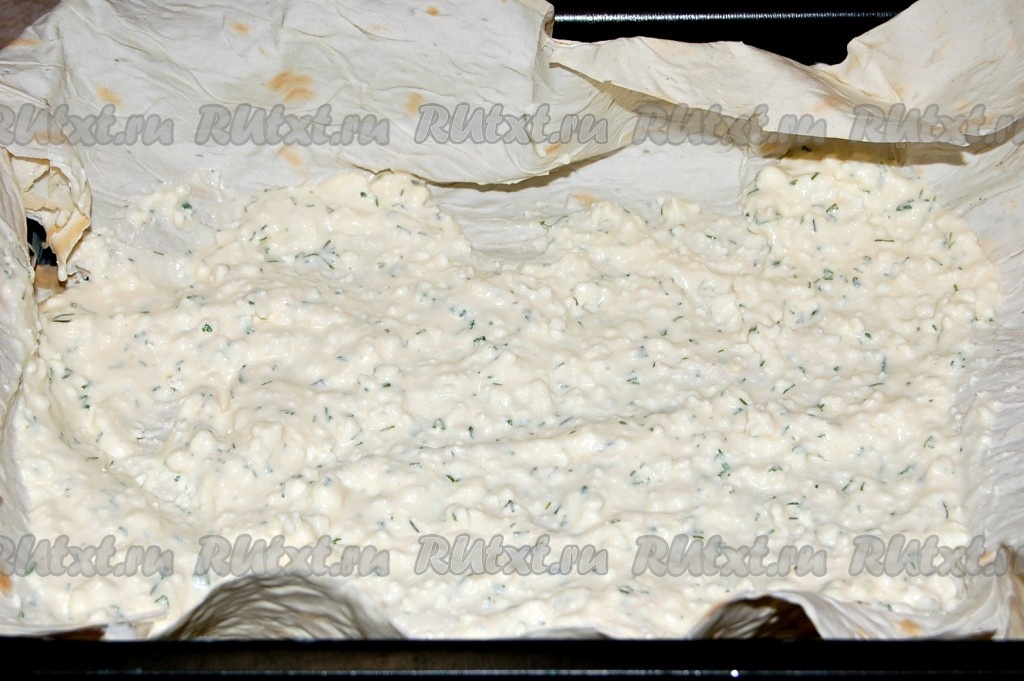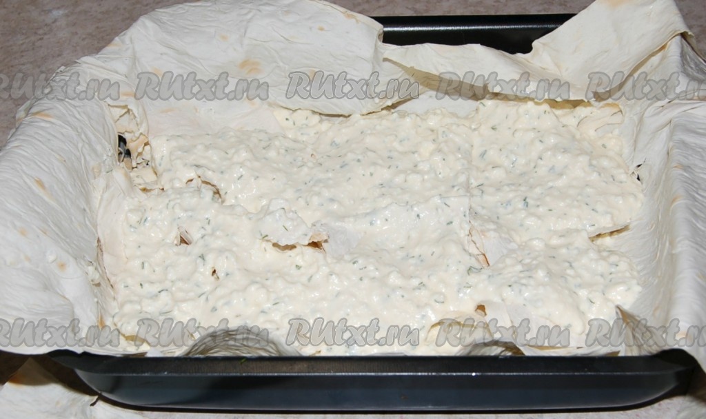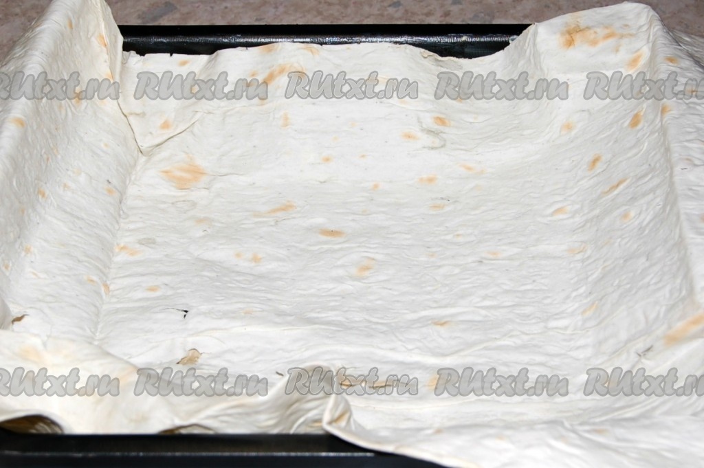 Выстелить форму изнутри листом лаваша таким образом, чтобы края лаваша свисали за пределы формы.