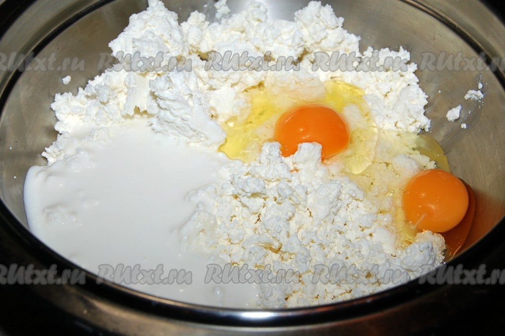 Мягкий сыр размять вилкой. Для приготовления начинки соединить в миске творог, сыр, кефир и 2 яйца.