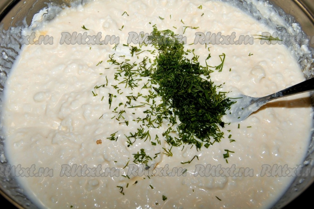 Перемешать творожно-сырную массу, по желанию, в неё можно добавить мелко нарезанный укроп. Посолить, если будет необходимость.