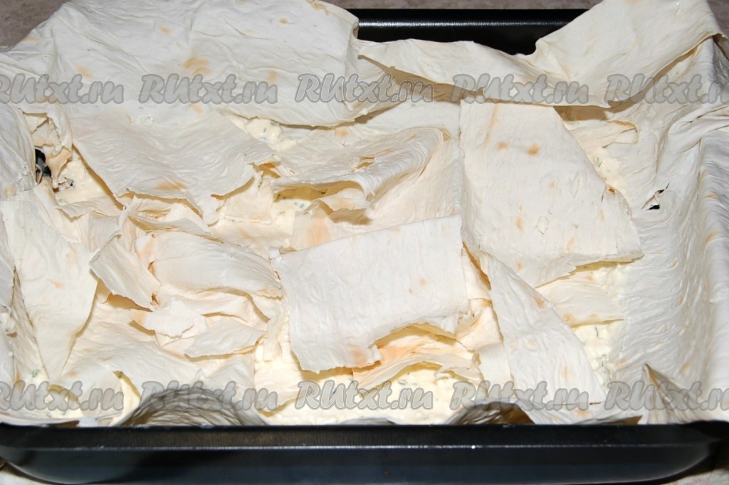 Начинку прикрыть следующим листом лаваша, заранее нарезанным с помощью ножниц на кусочки.