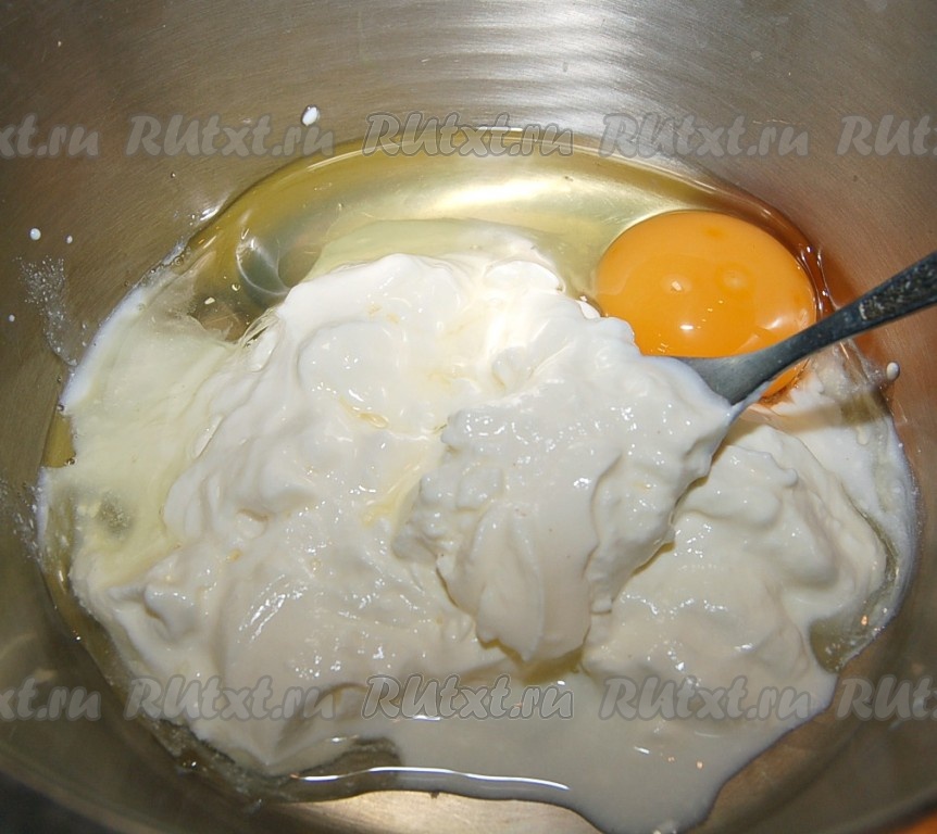 Отдельно смешать сметану с одним яйцом с помощью вилки (до однородности) и этой смесью залить весь пирог.