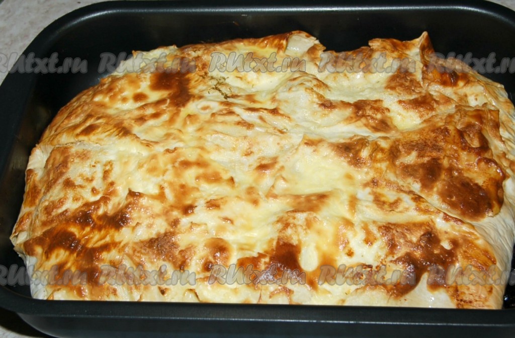 Выложить оставшиеся листы лаваша, нарезанные на кусочки. Накрыть свисающими листами лаваша, чтобы получился закрытый со всех сторон пирог.