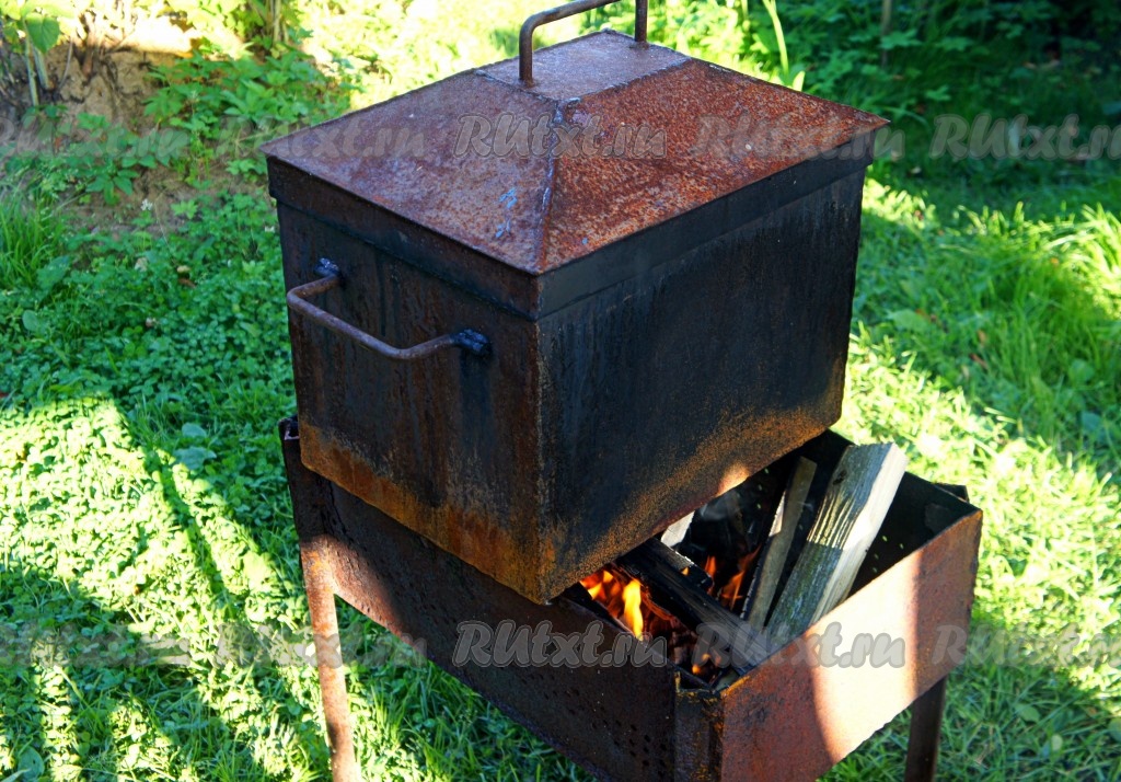 Поставить коптильню на угли. Для удобства приготовления можно поставить коптильню с рыбой на мангал с хорошими, подготовленными заранее углями и добавить ещё немного дров. Коптить рыбу примерно 20- 30 минут в зависимости от размера рыбы.
