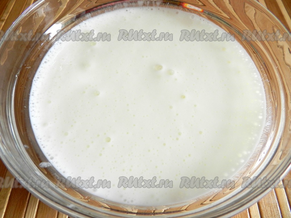 Теперь займёмся замешиванием теста для пирожков, для этого в достаточно объёмную миску нужно влить кефир, добавить соду, хорошо перемешать и оставить минут на 5, за это время сода погасится в кислой среде кефира и поверхность кефира покроется пузырьками.