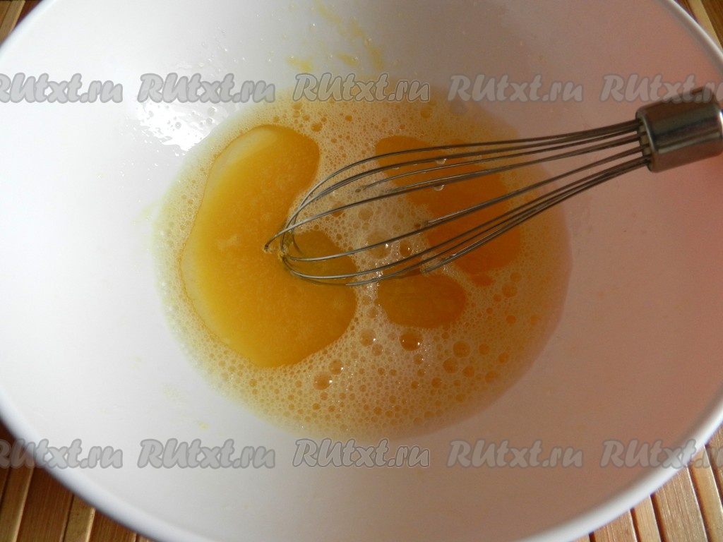 В глубокой миске яйца взбить с солью, сахаром и растительным маслом с помощью венчика до однородности.