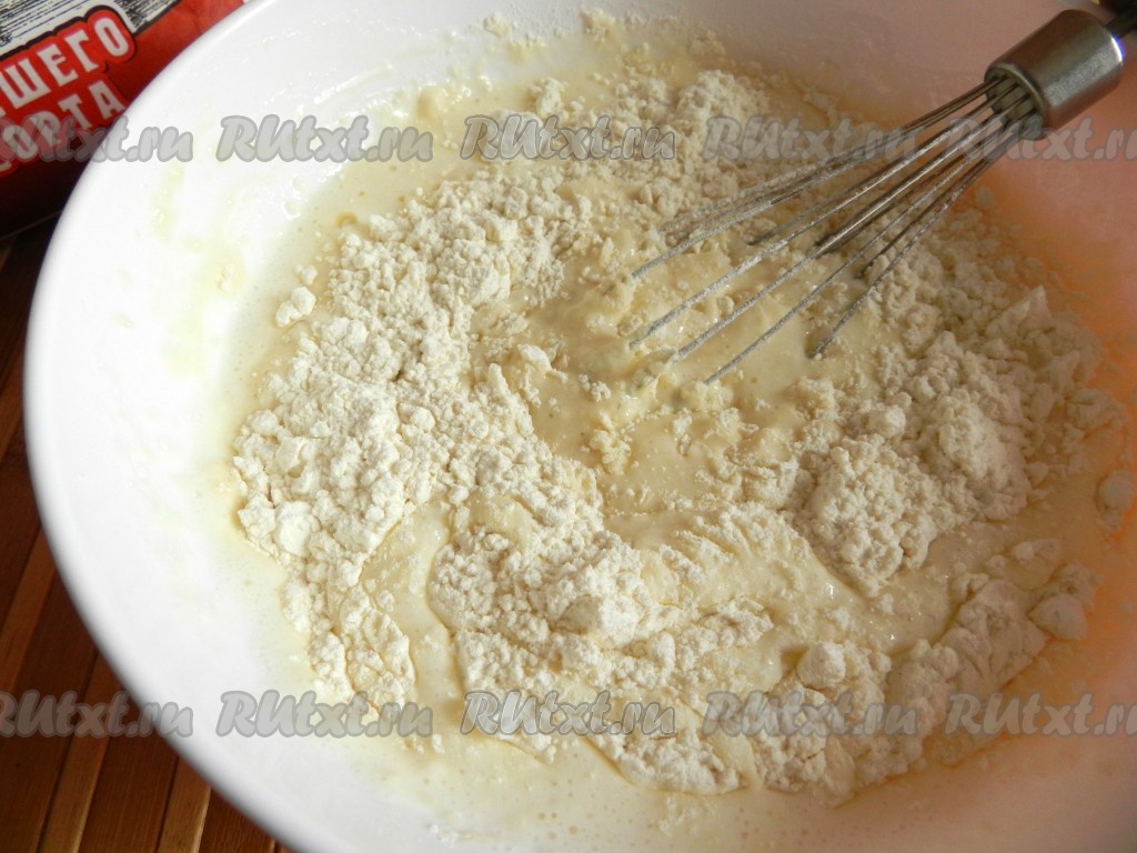 В смесь яиц, масла и сахара влить запенившуюся смесь кефира и соды, перемешать венчиком. Начать частями всыпать муку, замешивая тесто вначале венчиком.