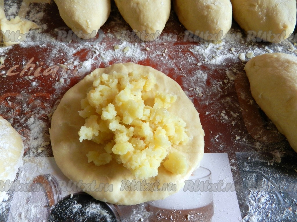 Каждый шарик из теста на присыпанной мукой поверхности размять руками в лепёшку (можно раскатывать скалкой), на середину выкладывать примерно столовую ложку картофельной начинки и, поднимая края теста над начинкой, формовать пирожок.