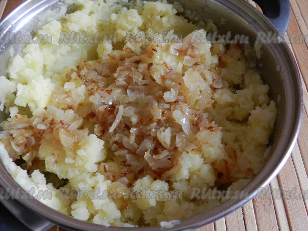 Прежде всего займёмся начинкой для пирожков, для этого очищенный картофель нужно выложить в кастрюлю, полностью залить водой, поставить на огонь, после закипания подсолить и варить до готовности картошки (минут 20-25) на небольшом огне, затем воду слить. В сковороде разогреть растительное и сливочное масло, выложить очищенный и мелко нарезанный лук, посолить и обжарить на среднем огне до золотистого цвета лука, иногда помешивая. Горячий картофель размять, добавить обжаренный лук вместе с маслом, поперчить, перемешать, остудить и начинка для пирожков готова.