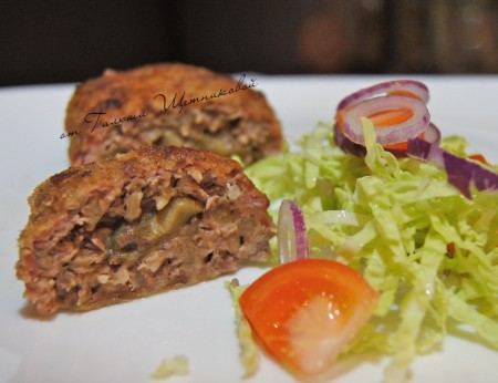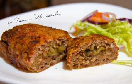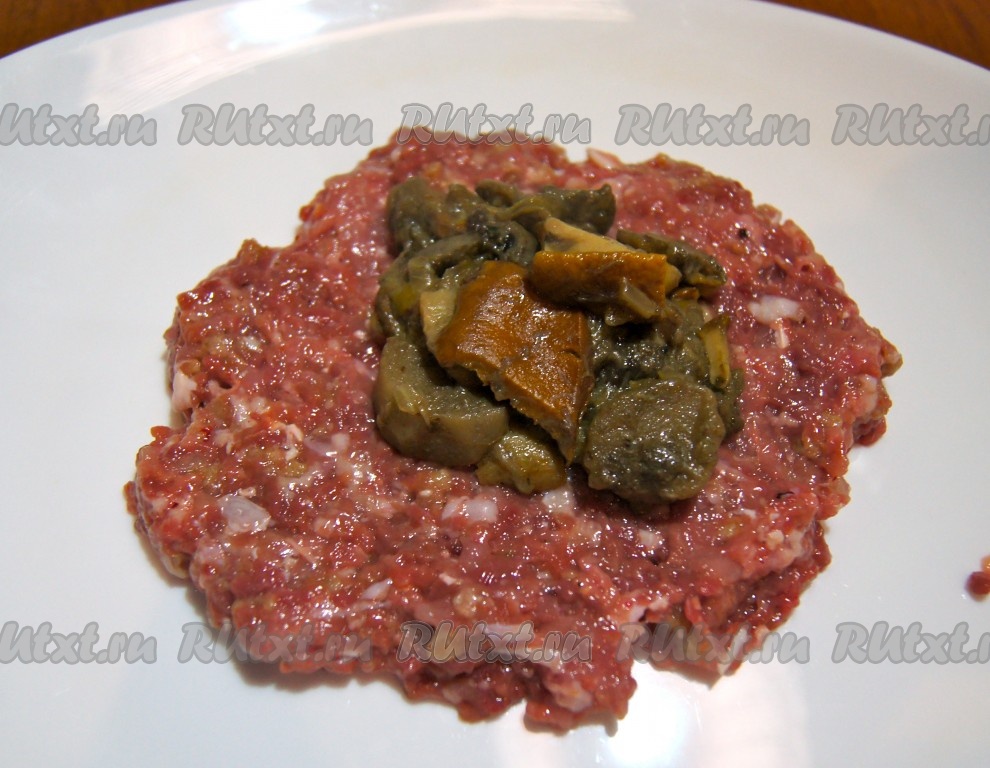 Из фарша формировать небольшие лепёшки. В центр каждой лепёшки выкладывать часть грибной начинки и защипывать края фарша, формируя котлеты.