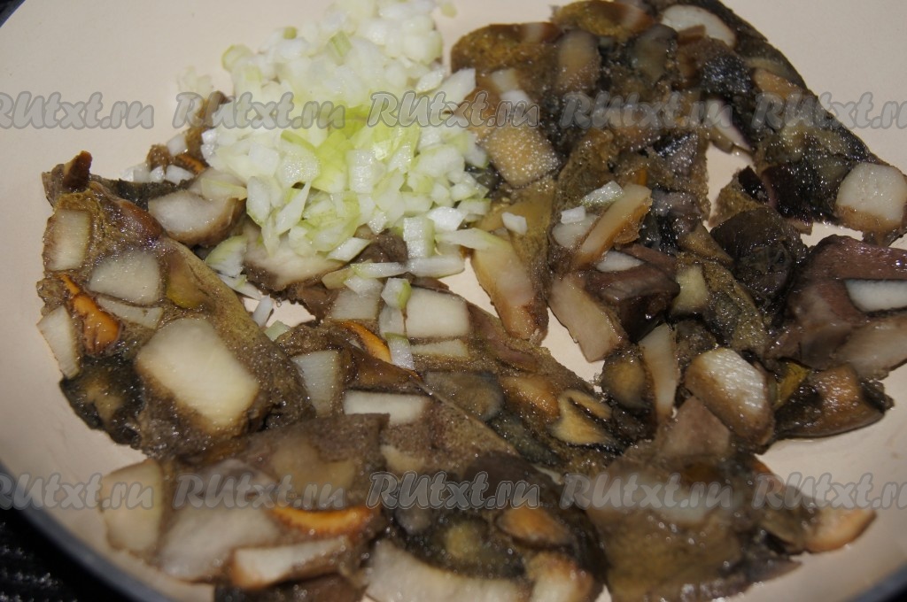Я готовила с отваренными замороженными грибами, их можно немного разморозить, а лишнюю воду слить. Если вы готовите со свежими лесными грибами, то их нужно перебрать, промыть водой, поместить в кастрюлю с водой, отправить на огонь и варить 25-30 минут с момента закипания на небольшом огне, затем выложить в дуршлаг, чтобы стекла вода, нарезать некрупно. Если готовите с шампиньонами, то их нужно просто вымыть и нарезать некрупно (отваривать их не нужно). Отваренные лесные грибы (или нарезанные свежие шампиньоны) обжарить с очищенной и мелко нарезанной луковицей на сливочном масле, помешивая, в течение 5-7 минут(до испарения жидкости), посолить, поперчить по вкусу, снять с огня и остудить. Грибная начинка для котлет готова.