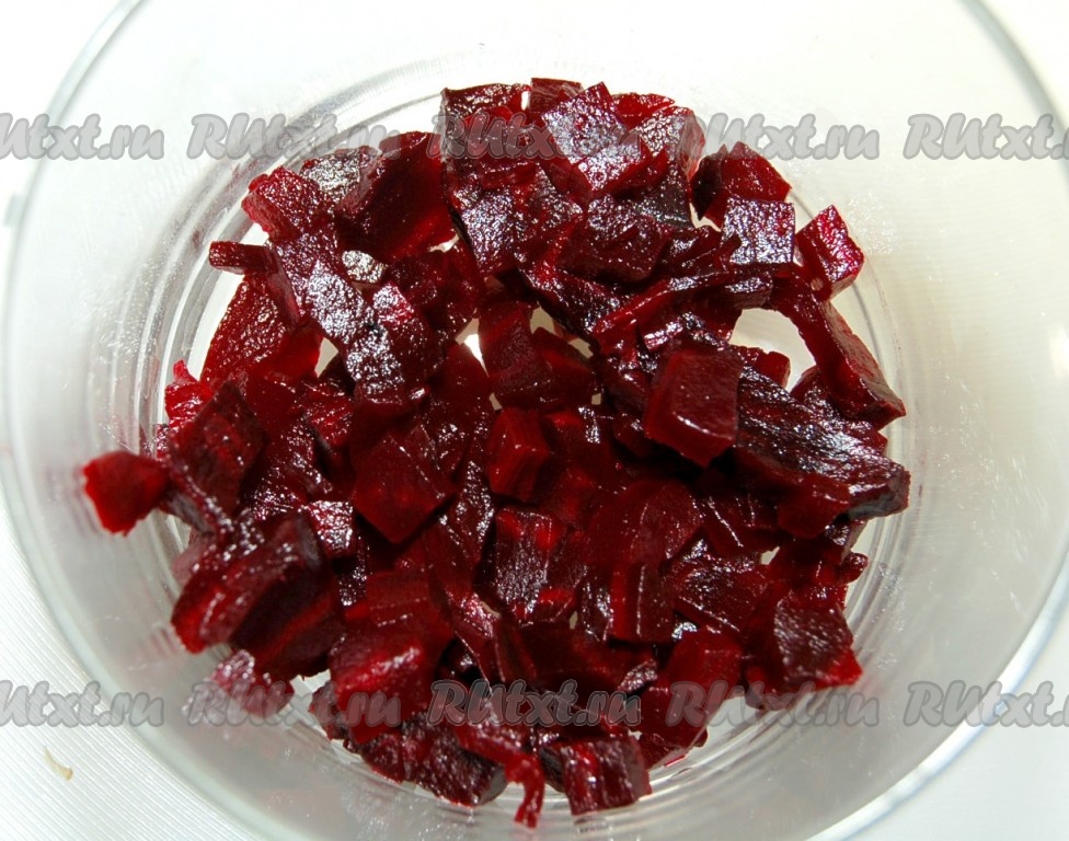 Когда свекла будет готова, вытащить ее из духовки, остудить, очистить от кожицы и нарезать мелкими кубиками.