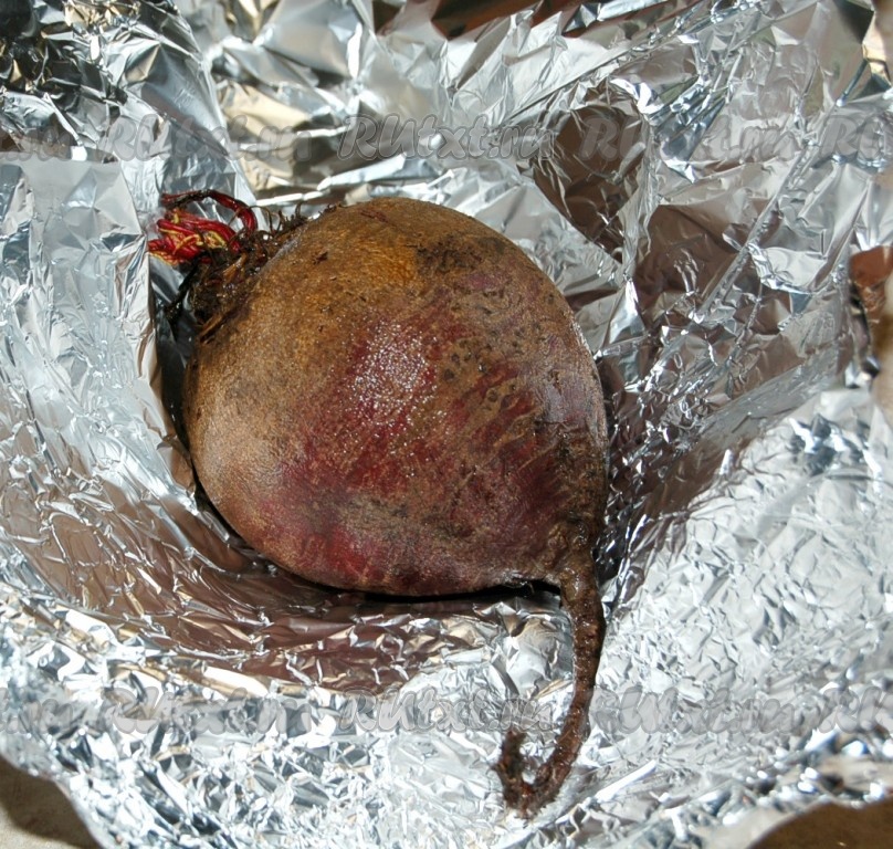 Свеклу помыть, слегка обсушить с помощью салфетки, завернуть в фольгу.