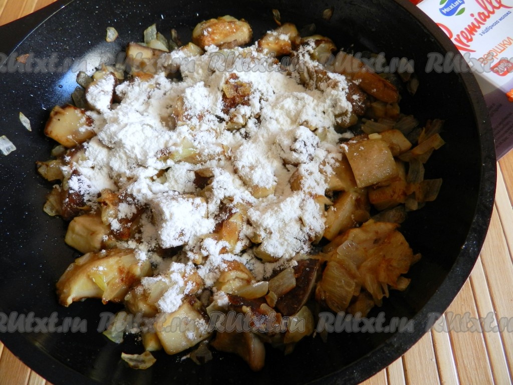 Добавить муку, перемешать, чтобы мука обжарилась.