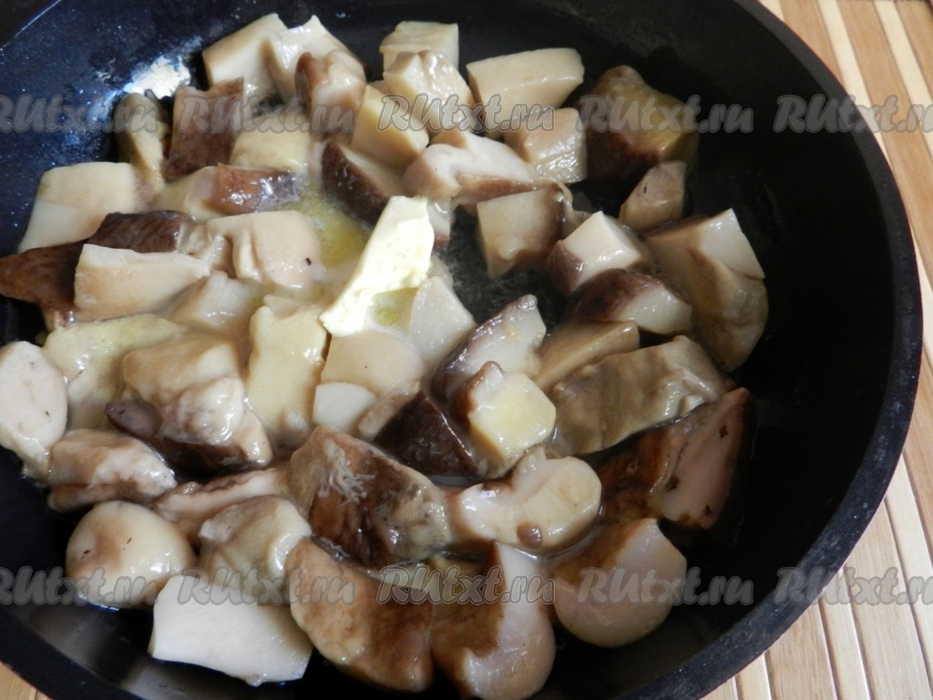 Обжарить грибы на растительном и сливочном масле.