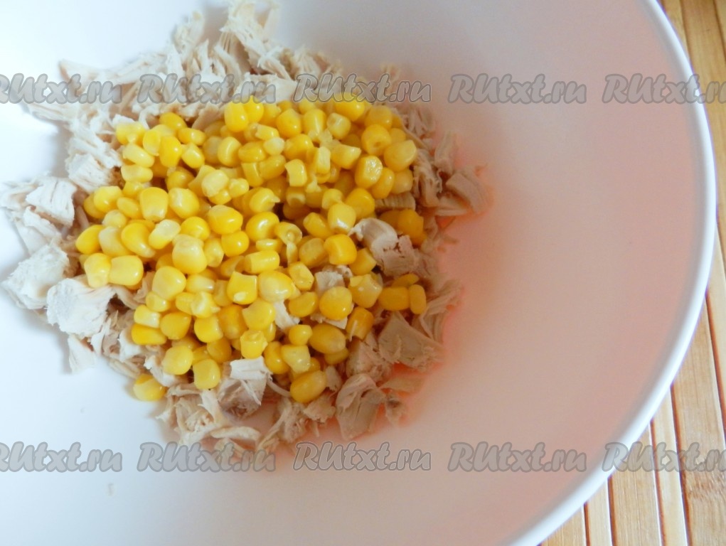 Остывшее куриное филе нарезать на небольшие кусочки, переложить в глубокую миску, добавить консервированную кукурузу без жидкости.