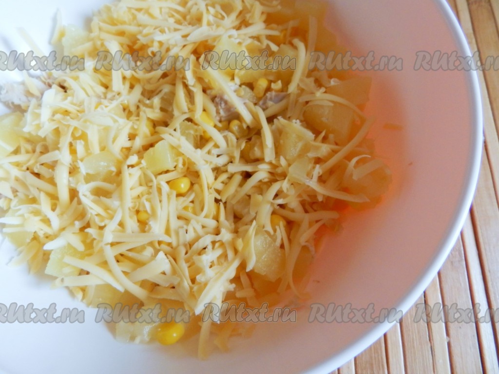 Сюда же выложить сыр, натёртый на крупной тёрке, и ананасы, нарезанные на небольшие кубики.