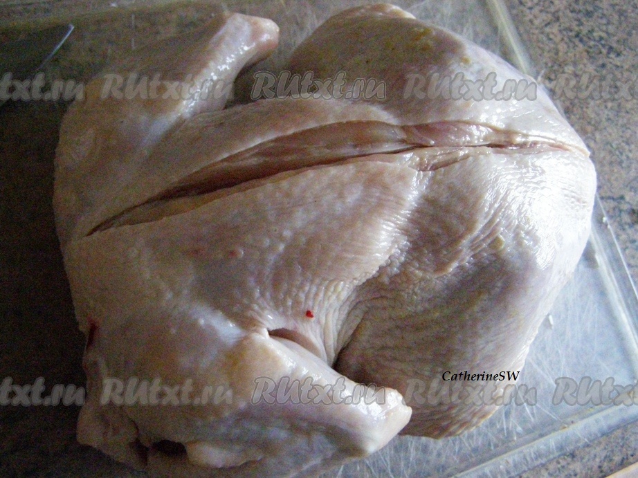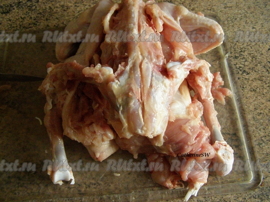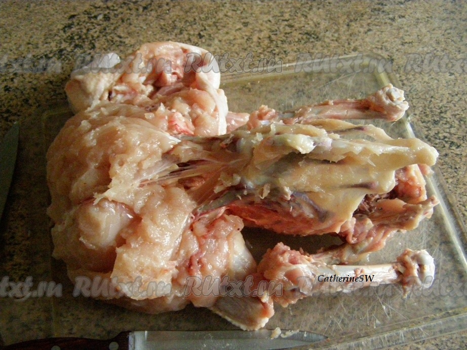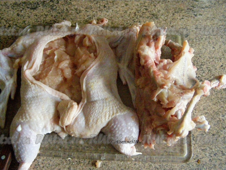 2. Сделаем по спине продольный разрез, аккуратно, чтобы не повредить кожу, отделим кости от мяса и кожи.