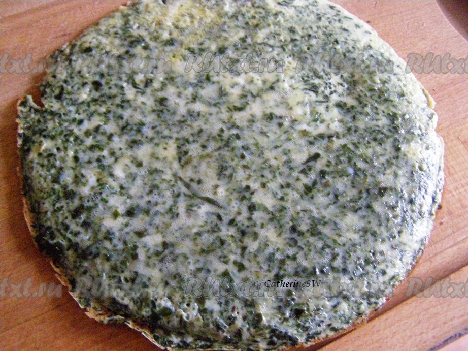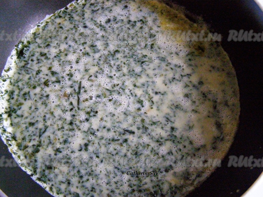 9. На сковороде на среднем огне растопим сливочное масло, выльем яично-шпинатную смесь, закроем крышкой, доведем омлет до готовности.